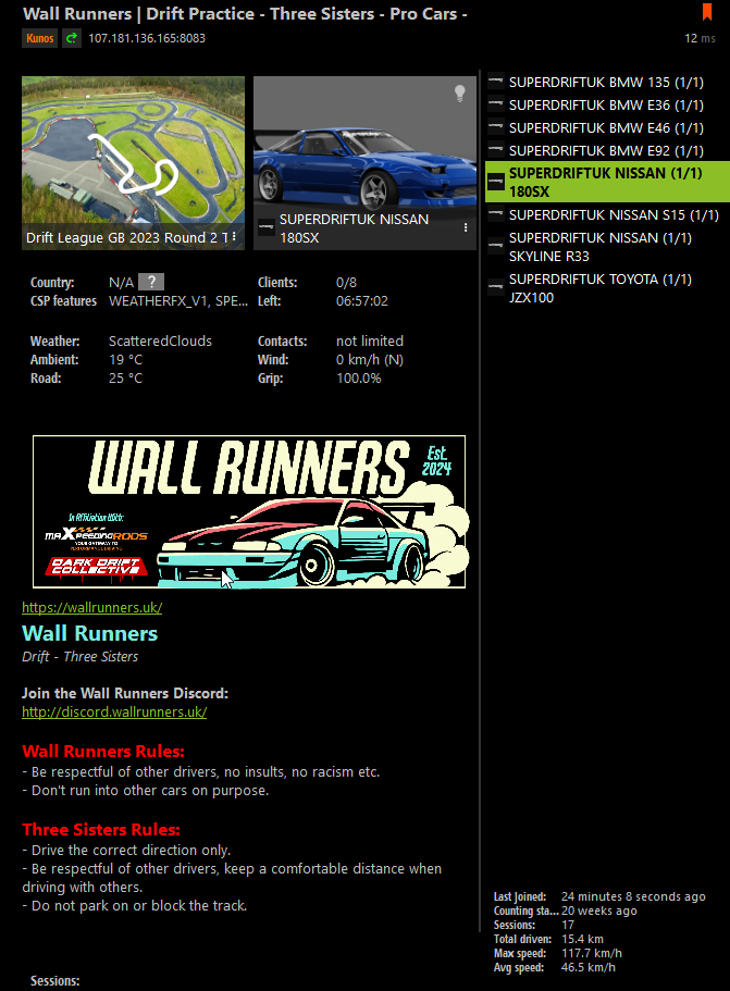 We have settled on “Three Sisters” with a nice handful of the Superdrift UK Pro cars. The server is now up and running and both of the track, and cars can be downloaded via Content Manager, using the “Install Missing Content” button.